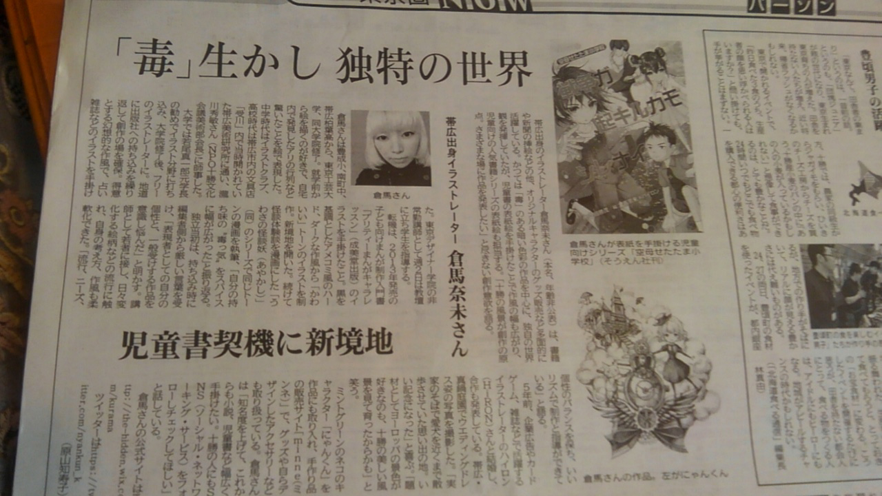 倉馬奈未が十勝毎日新聞さま「東京圏NOW」に取材をして頂きました。