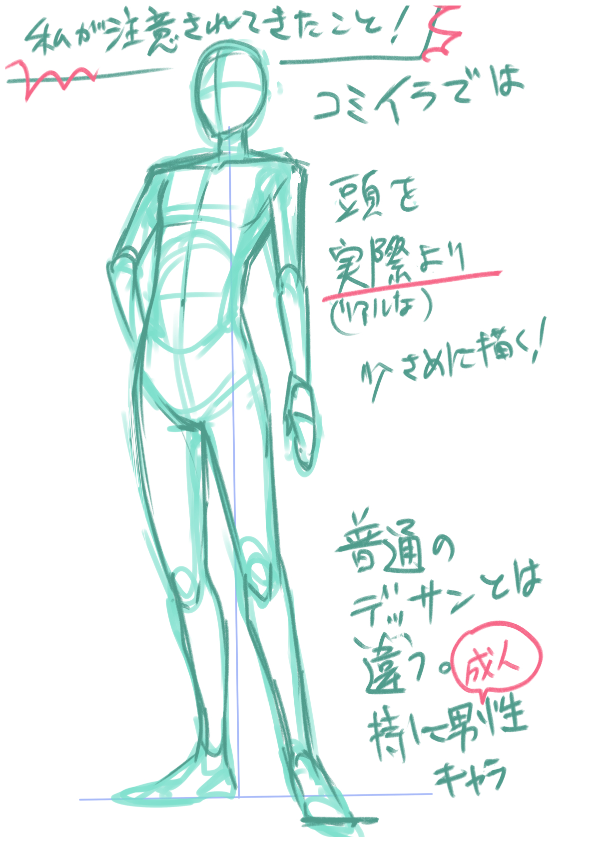 女性で「頭を小さめ」に描くとスーパーモデル的な体系の雰囲気になるかもです。